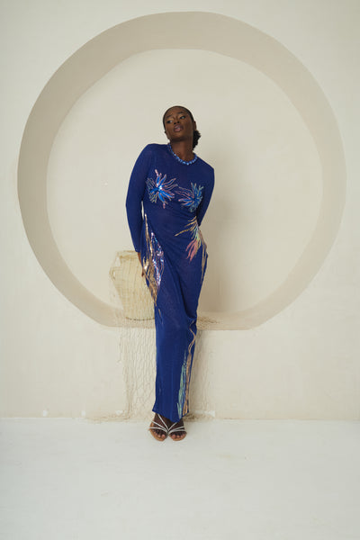 Deepwater Gown — Transparent Mesh with Hand-Sewn Beads & Sequins