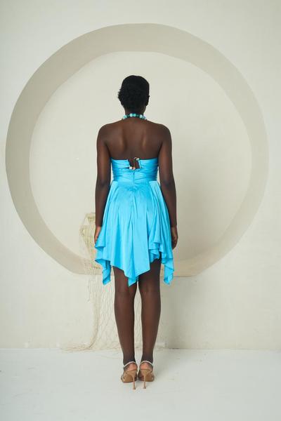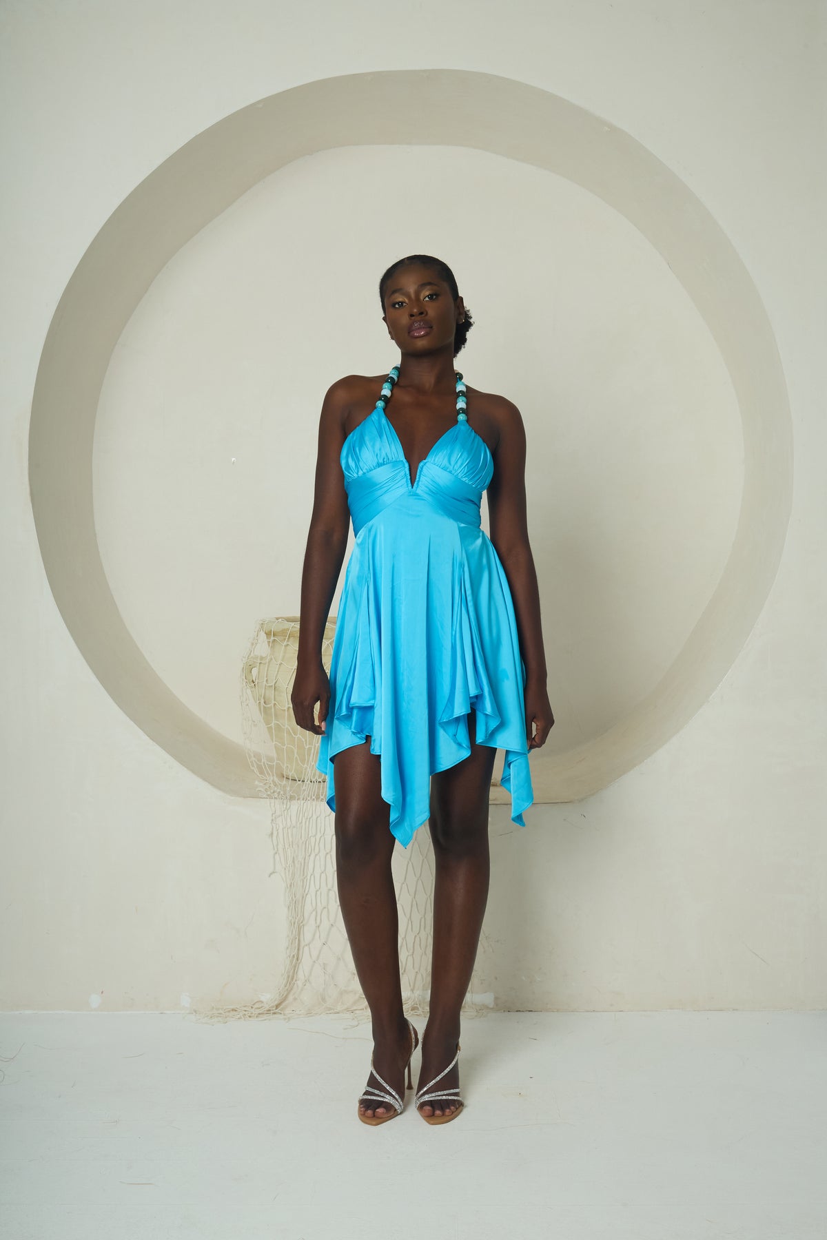 The Beri Mini celebrates the Ijaw tradition of ornamentation and water symbolism through a sleek, contemporary silhouette. Cut from lustrous stretch satin, the fitted mini is elevated by hand-beaded halter straps that glisten like droplets catching the sun. An asymmetric hemline ripples with movement, echoing the rhythm of waves and tides. A playful yet refined piece that bridges heritage with modern femininity.