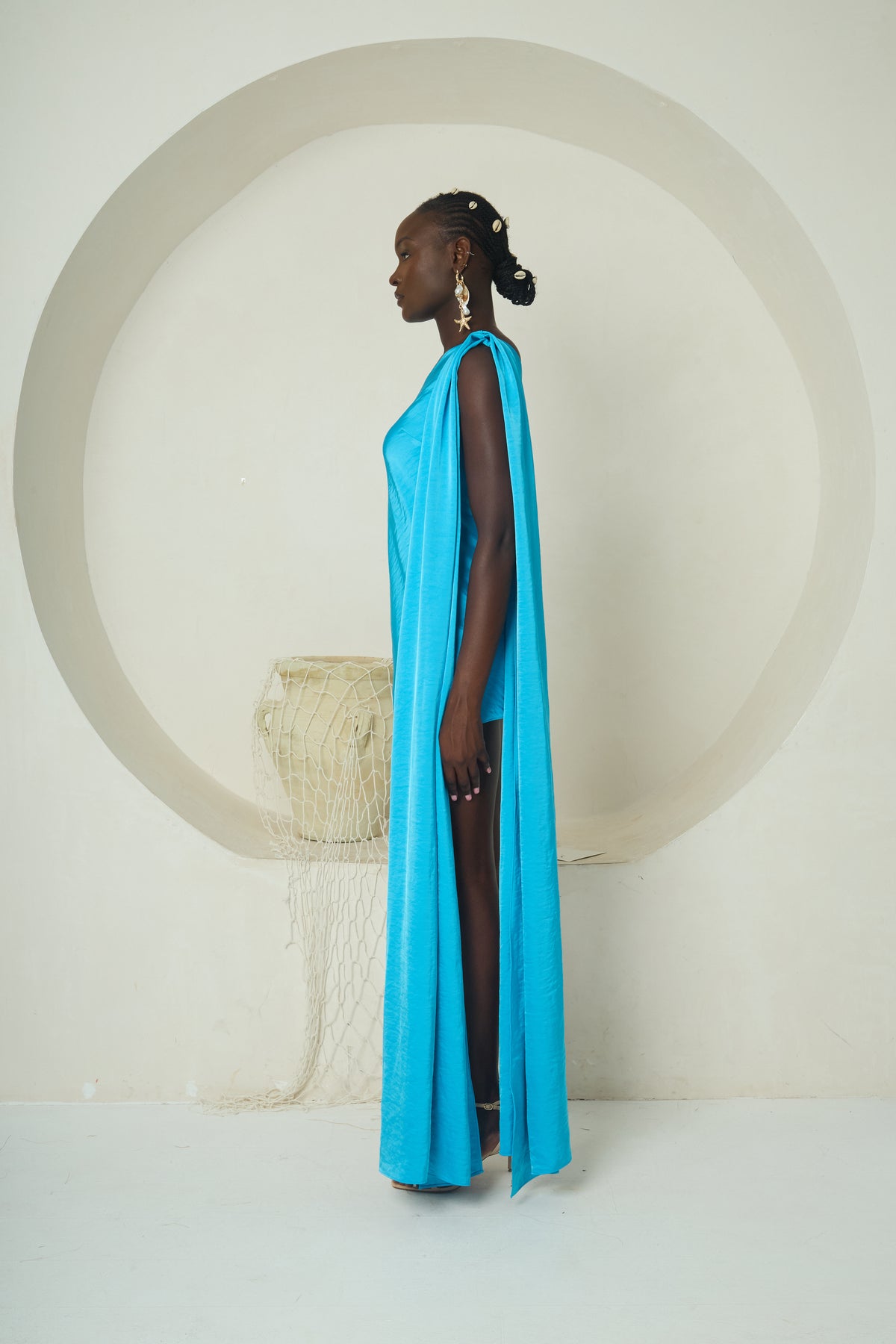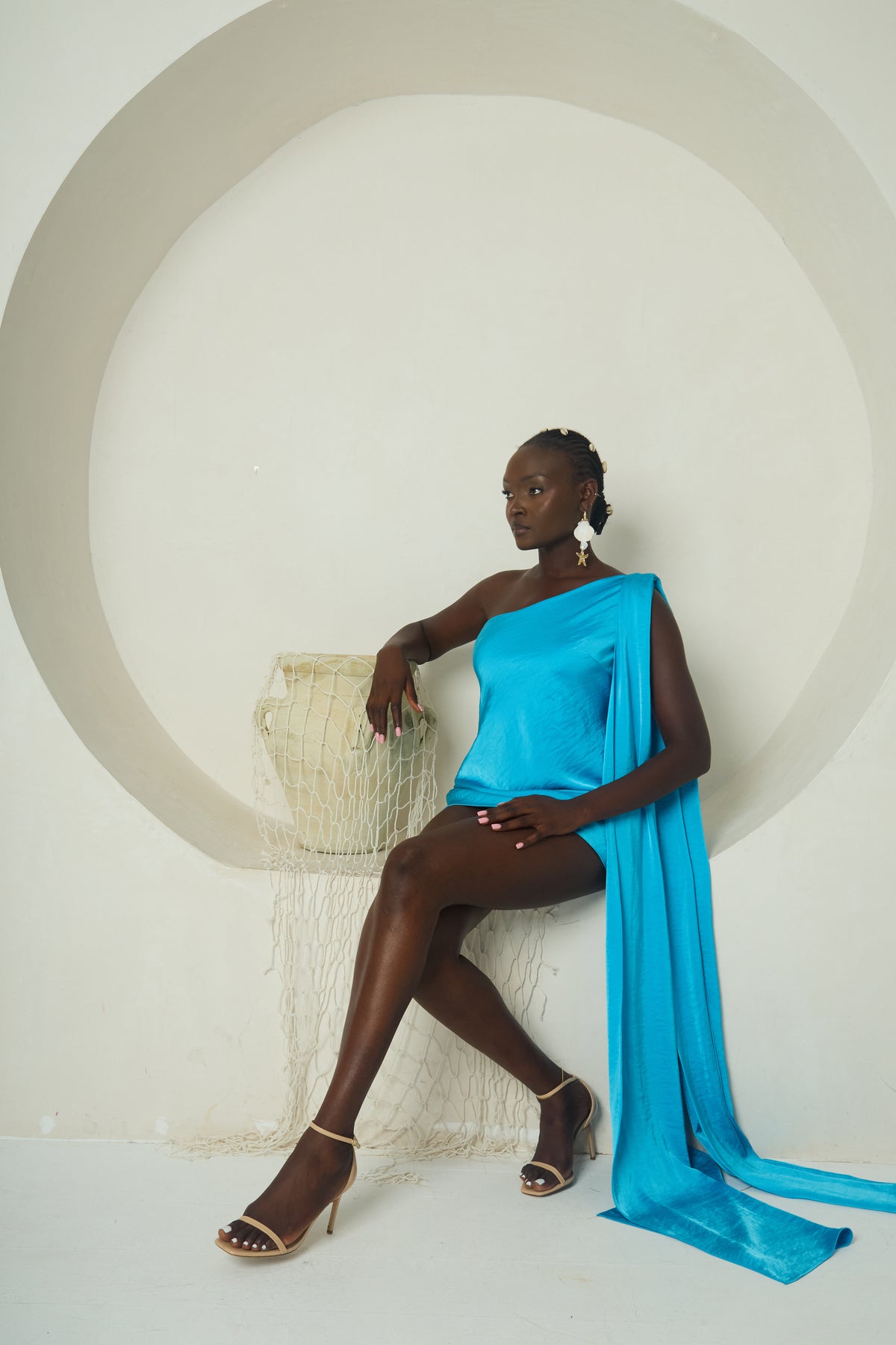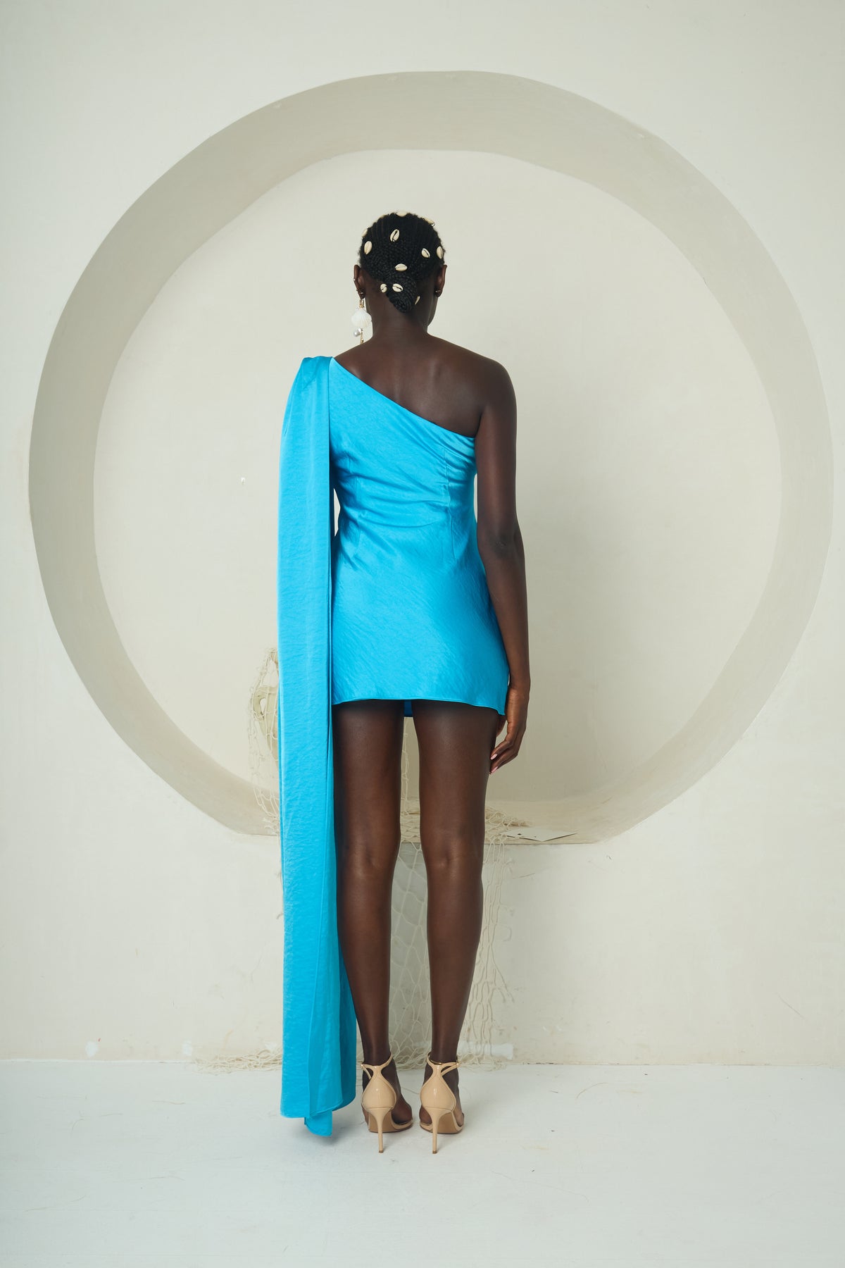 The Keme Mini captures the strength and rhythm of the tide in a modern, sculptural silhouette. Cut from glossy aquamarine stretch satin, this one-shoulder mini is defined by a long, fluid panel that cascades from the shoulder to the floor, echoing the endless motion of waves. Designed to sculpt and flatter, it embodies both boldness and flow.